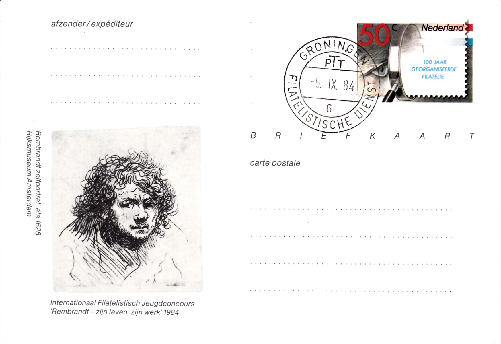 Zum Internationalen Philatelistischen Jugendwettbewerb der FIP-Jugendkommission erschien in den Niederlande eine Postkarte als Ganzsache mit einem Selbstporträt von Rembrandt als Zudruck. Hier ein leider nicht gelaufenes gestempeltes Exemplar.