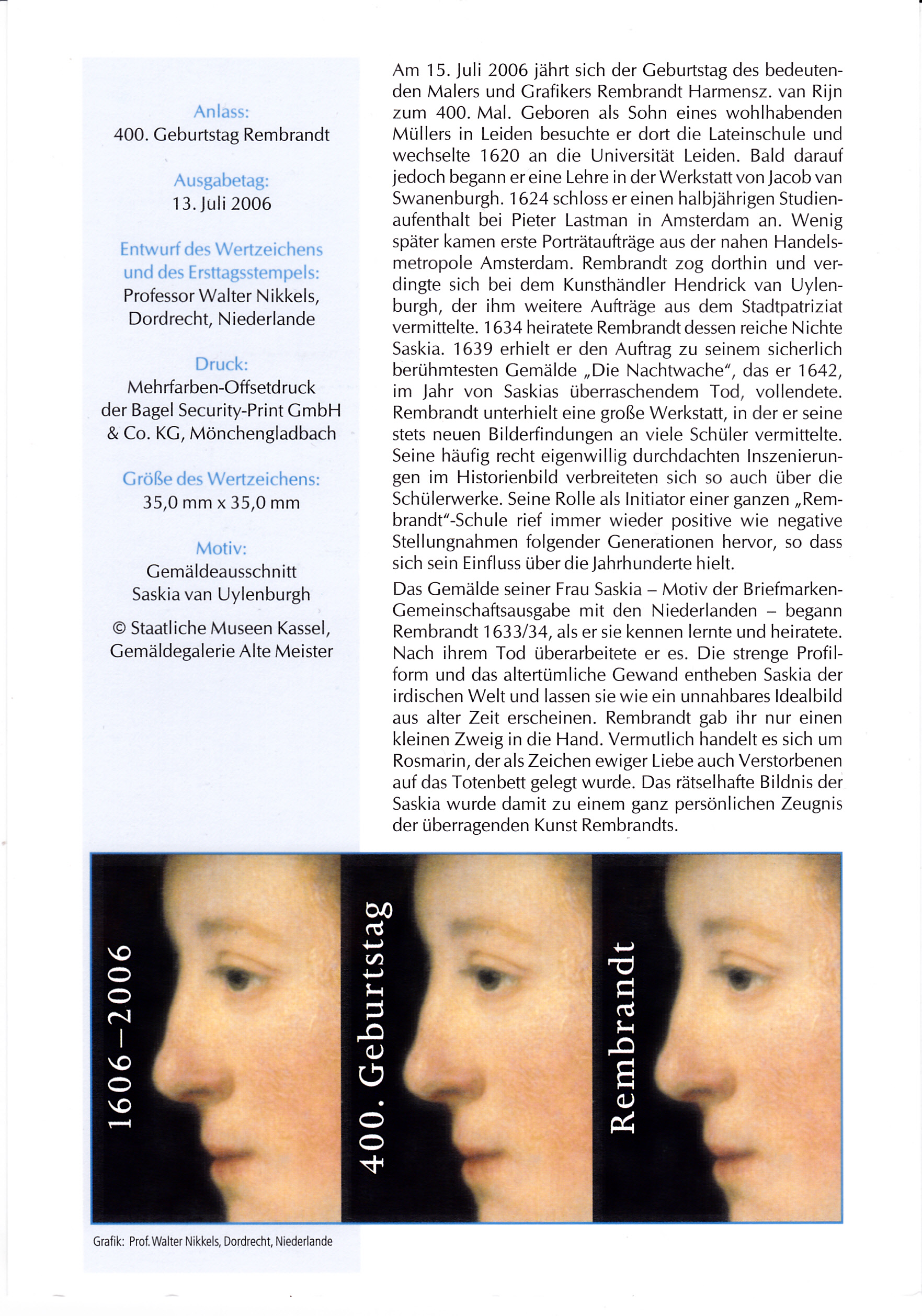 Das Ersttagsblatt der Deutschen Post mit der Marke zum 400. Geburtstag von Rembrandt (MiNr 2550) zeigt auch die bildgleiche Marke aus den Niederlande (MiNr 2412).