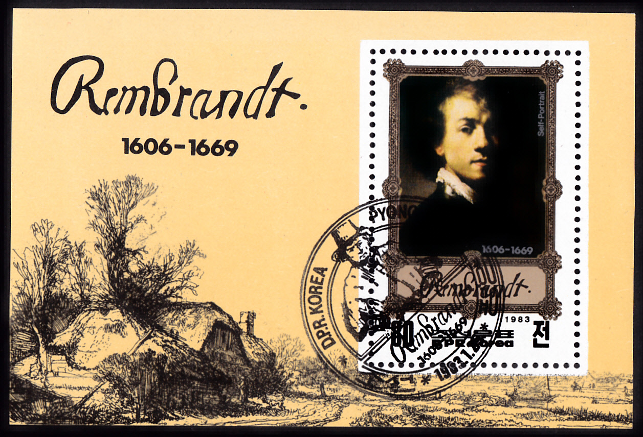 Aus Nord-Korea kommt dieser Block (MiNr Block 137 mit Marke MiNr 2327) mit einem Selbstporträt von Rembrandt.