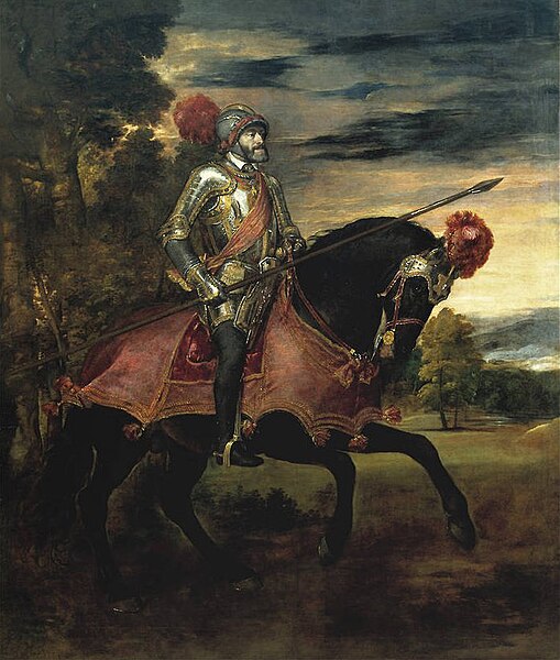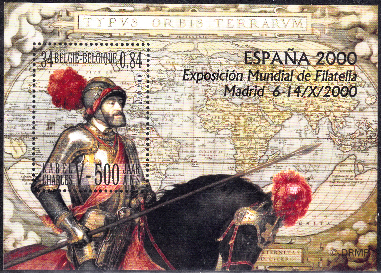 Auf diesem Block zur Internationalen Briefmarkenausstellung ESPAÑA 2000 in Madrid aus Belgien (MiNr Block 76 I mit Marke MiNr 2940) sehen wir Karl V. zu Pferde vor einer historischen Landkarte. Der reitende Karl V. ist ein Ausschnitt aus einem Gemälde von Tizian.