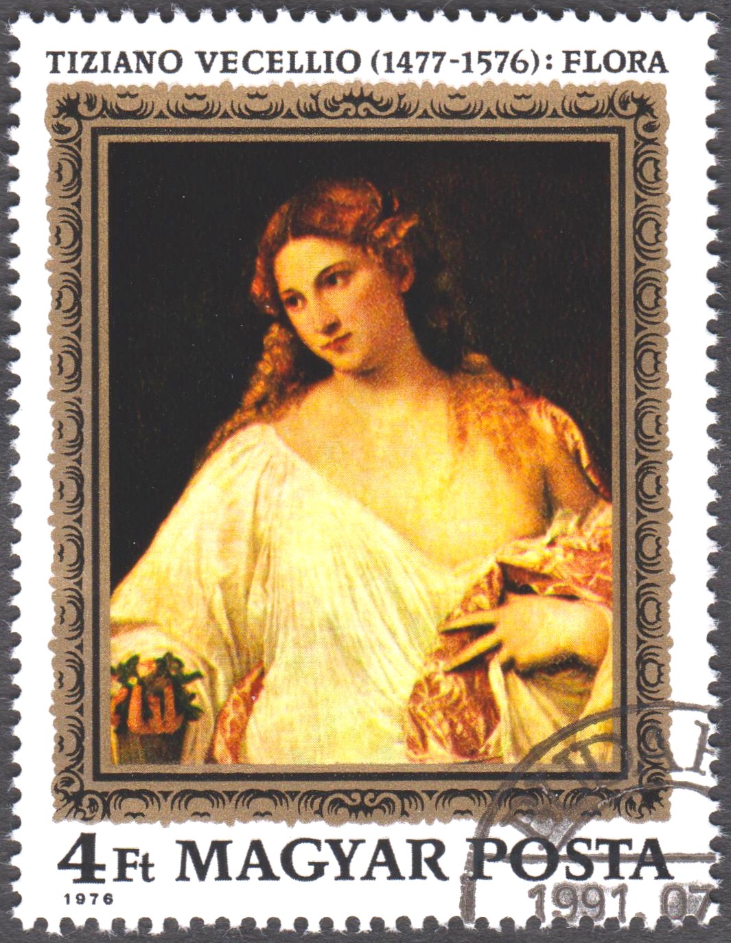 Dieses Postwertzeichen, Ungarn MiNr. 3135 A, erschien aus Anlass des 400. Tadestages von Tizian und zeigt das Gemälde "FLORA":