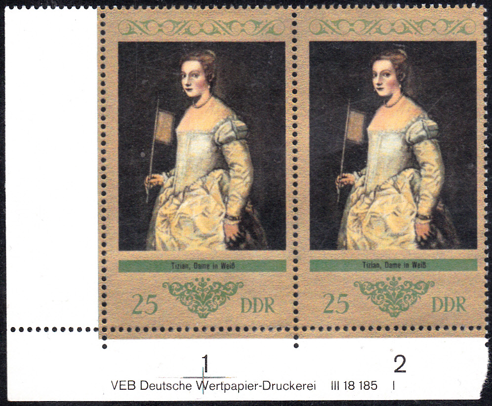 Auf einer Marke aus der DDR (MiNr 1895) ist das Gemälde "Dame in Weiß" von Tizian abgebildet. Hier ein waagerechtes Paar vom linken unteren Bogenrand mit Druckvermerk und Bogenzählnummer.