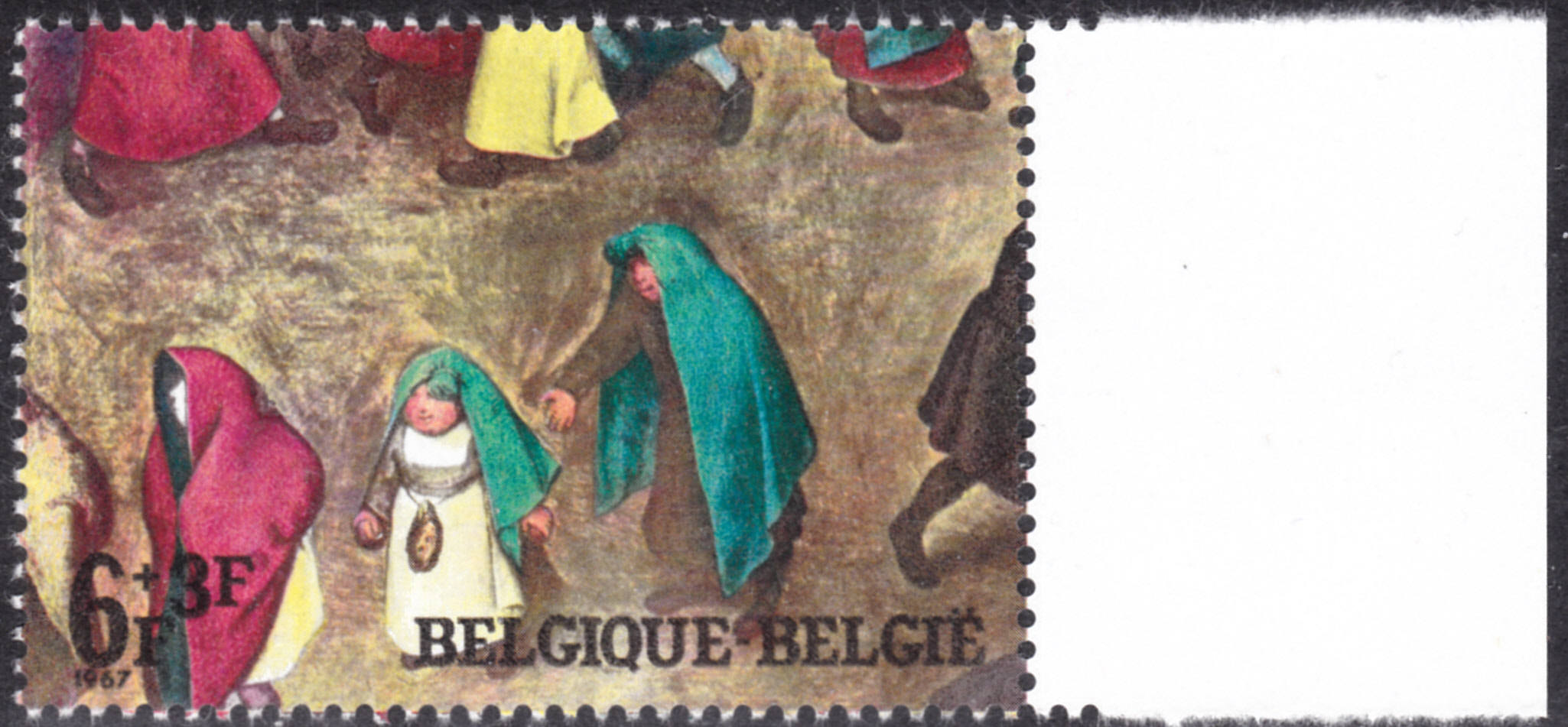 Die Marke zu 6 F + 3 F (MiNr 1497) zeigt einen kleinen Ausschnitt aus dem linken unteren Bereich des Originalgemälde.