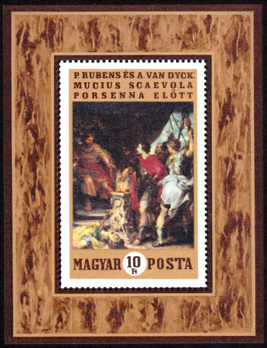 Auf diesem Block aus Ungarn (MiNr Block 74 A mit Marke MiNr 2563 A) zeigt das Gemälde "Mucius Scaevola vor Porsenna". Es ist eine Gemeinschaftsarbeit von Peter Paul Rubens und Anthonis van Dyck (1599-1641).