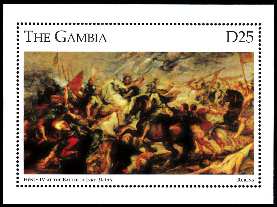 Aus Gambia kommt auch dieser Block (MiNr Block 277 mit Marke 2304) . Auf der Marke wird ein Ausschnitt aus dem Gemälde "Henry IV in der Schlacht bei Ivry" von P. P. Rubens gezeigt.