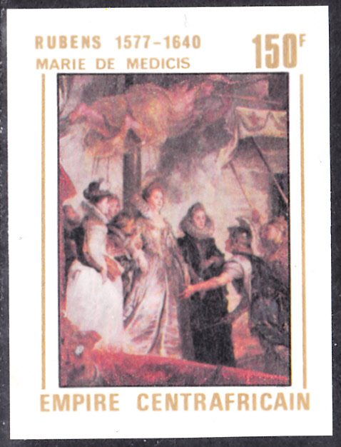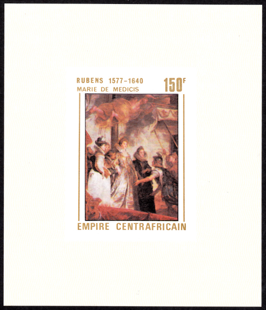 Zur Ausgabe der Zentralafrikanischen Republik gehört auch noch ein Block (MiNr Block 22 mit Marke MiNr 530). Er zeigt das Gemälde "Die Geschichte der Maria von Medici". Das Werk befindet sich im Louvre in Paris.