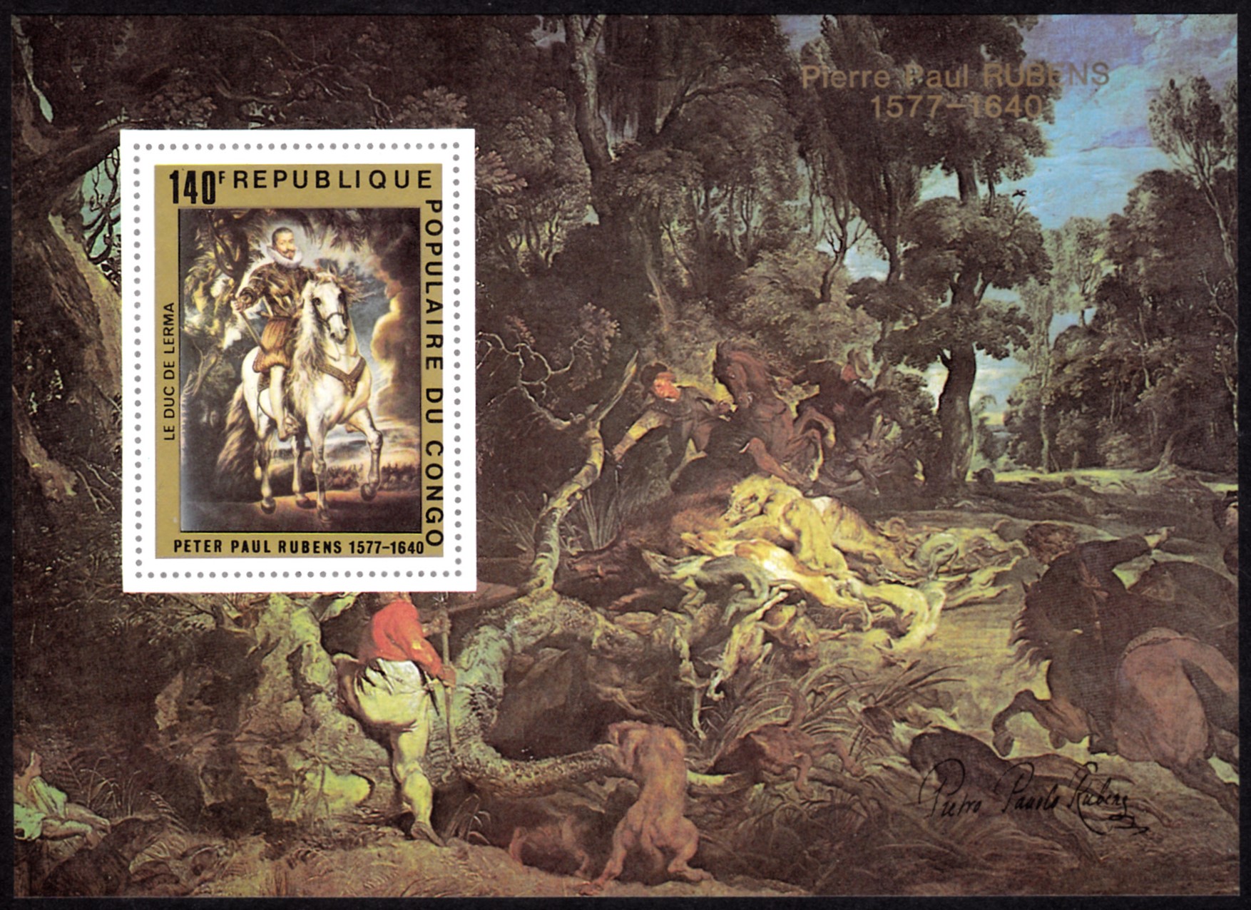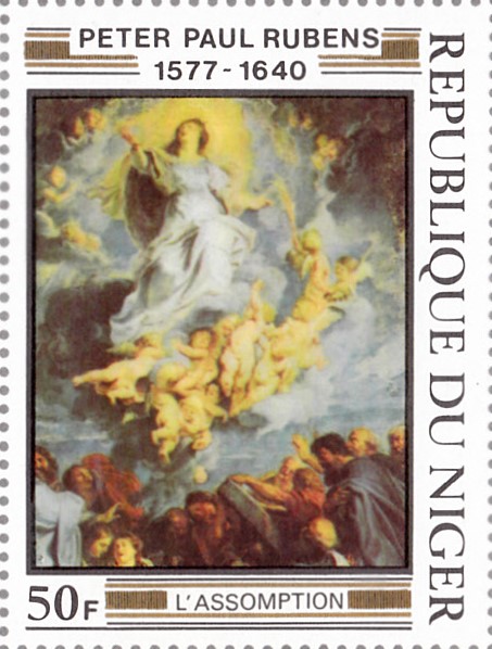 Im Niger erschienen zum 400. Geburtstag von Peter Paul Rubens außer dem bereits auf der ersten Seite hier schon gezeigten Block auch noch eine Serie mit fünf Märken. Eine Marke zu 50Fr (MiNr 607) zeigt das Gemälde "Mariä Himmelfahrt" von Rubens.