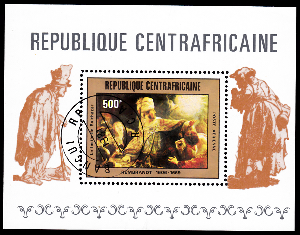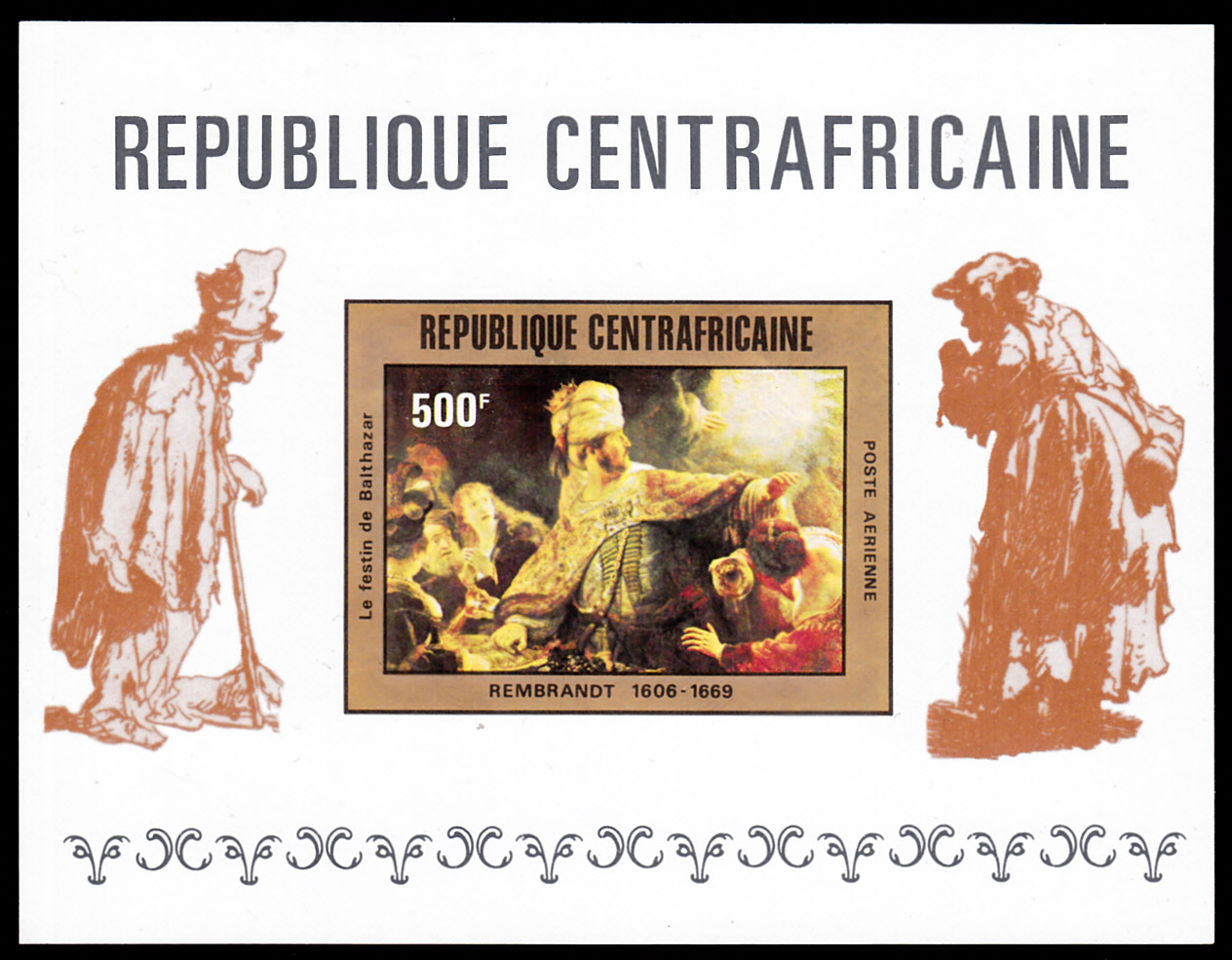 Zum 375. Geburtstag von Rembrandt ist in einer Ausgabe der Zentralafrikanischen Republik auch ein Block (MiNr Block 114 mit Marke MiNr 725) erschienen. Die Marken zeigt das Gemälde "Das Gastmahl des Belsazar" von Rubens.