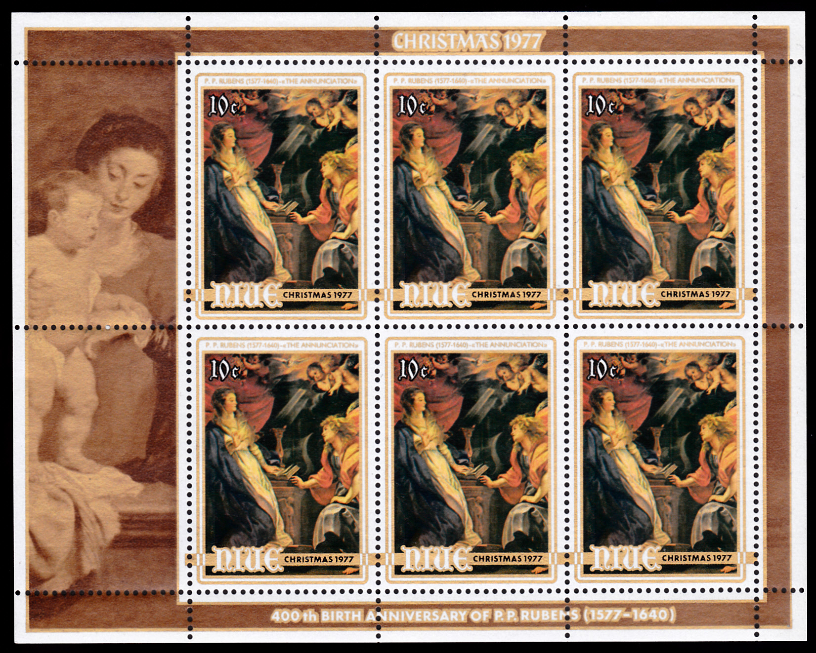 Diese sieben Marken sind zusammen mit zwei weiteren Marken mit Gemälden von Albrecht Dürer in einem Bogen gedruckt worden. Hier zeige ich den kompletten Bogen.