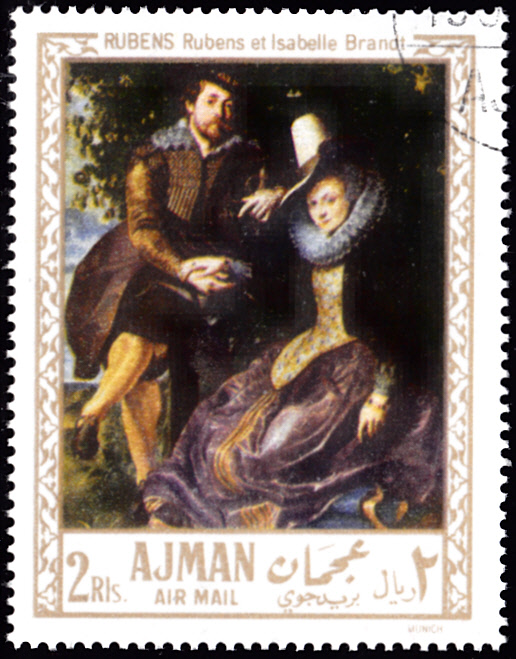 Aus einer Serie aus Ajman kommt diese Marke (MiNr 227 A) mit dem Gemälde "Die vier Philosophen" von P. P. Rubens. Abgebildet sind folgend von links nach rechts: P. P. Rubens, sein Bruder Philipp, der Gelehrte Lipsius und dessen Schüler Jan van der Wouwere.