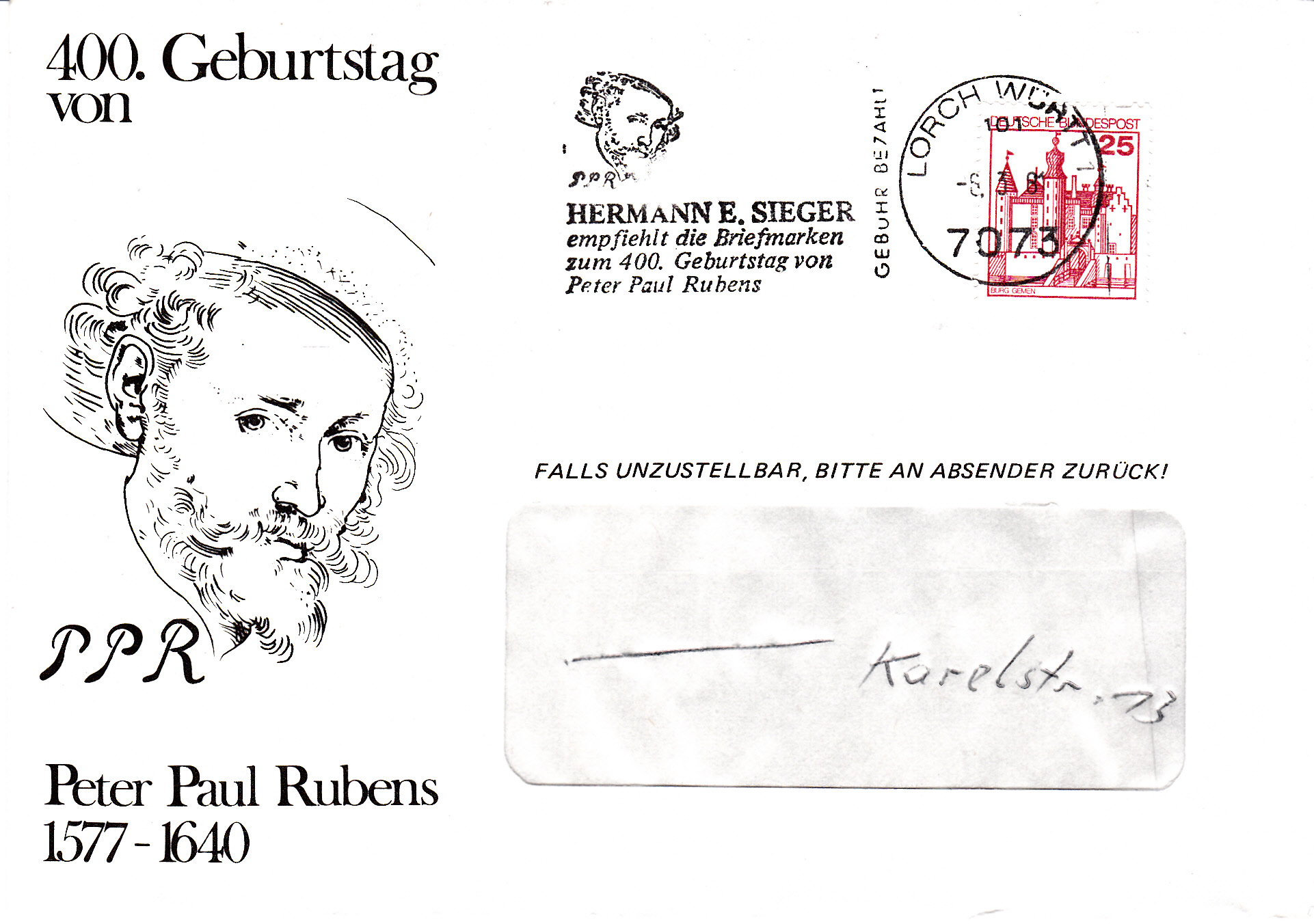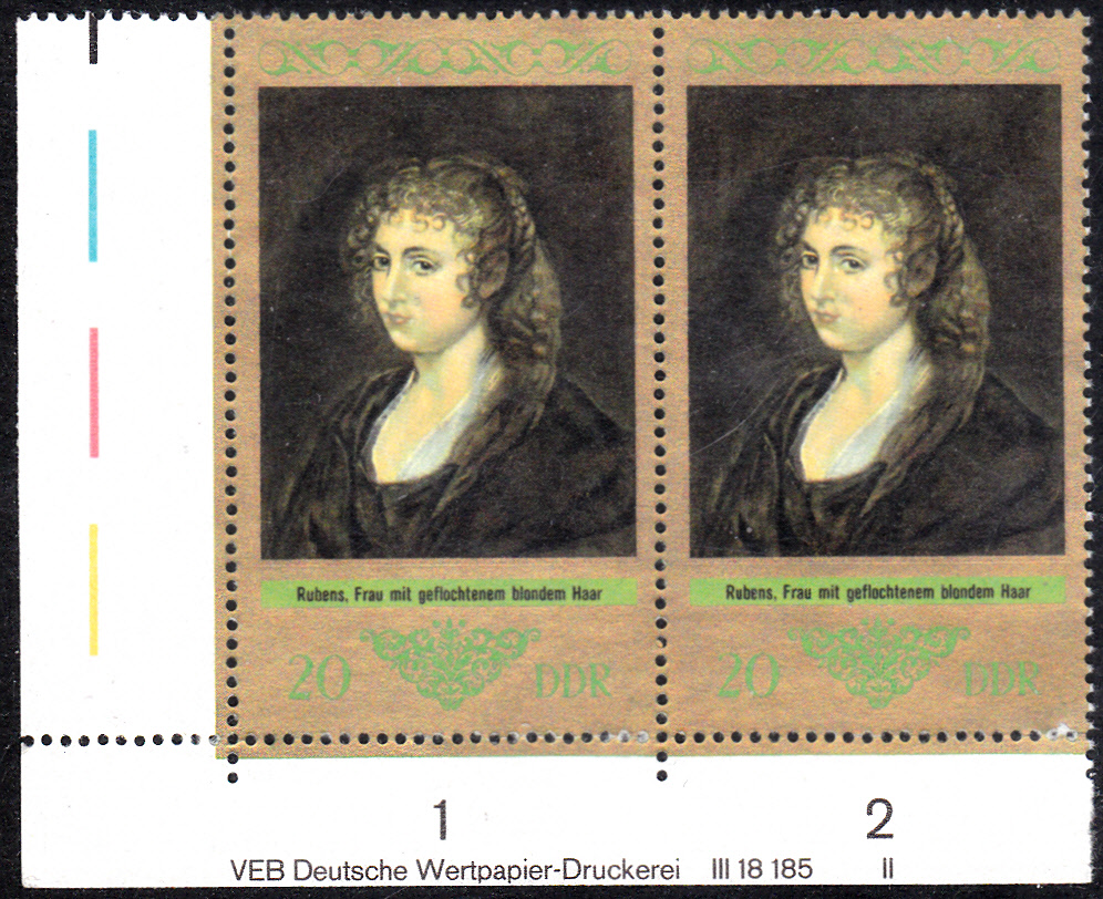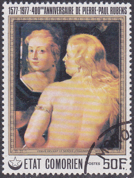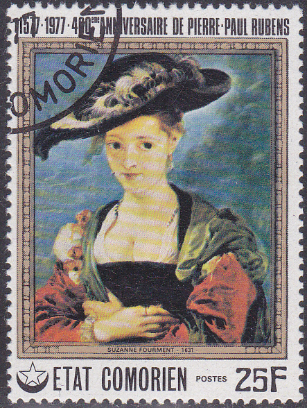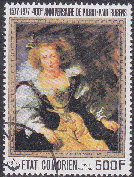 Zum 400. Geburtstag von Rubens erschien in einer Serie auf den Komoren diese Marke (MiNr 353), die wie die im ersten Beitrag hier von Rüdiger gezeigte Marke aus der Jemenitischen Arabischen Republik das Gemälde im Jahre 1616 gemalte Porträt seiner Tochter Clara Serena Rubens zeigt.