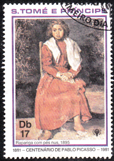 Zum 100. Geburtstag von Pablo Picasso erschien in einer Serie in São Tomé und Príncipe diese Marke mit dem Gemälde "Junges Mädchen" von Picasso.