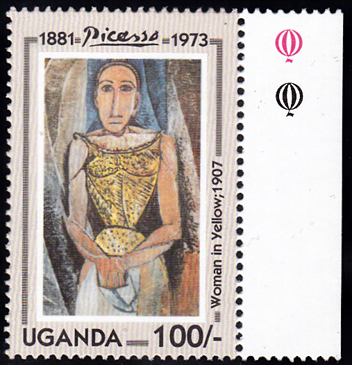 Zum 20. Todestag von Pablo Picasso ist in Uganda diese Marke (MiNr 1291) mit dem Gemälde "Frau in Gelb" von Pablo Picasso.
