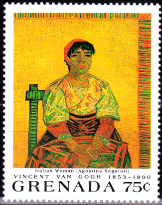 Diese Marke aus Grenada aus der Serie zum 100. Todestag von Vincent van Gogh zeigt uns das Gemälde "Agostina Segatori". Agostina Segatori war Inhaberin des Cafe Le Tamborin, in dessen Räume van Gogh 1887 eine Ausstellung mit Ukiyo-e-Holzschnitten organisierte. Mit ihr hatte er kurzzeitig eine Liebesbeziehung.