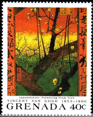 Diese Marke aus Grenada (MiNr. 2259) aus der Serie zum 100. Todestag von Vincent van Gogh bildet einen seiner Ukiyo-e-Holzschnitte ab, der den Titel "Blühender Apfelbaum" trägt.