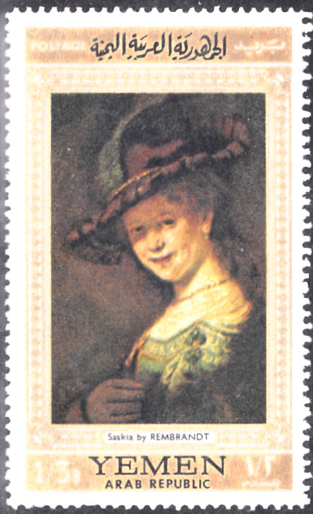 Auf dieser Marke aus Jemen-Nord (Arab. Republik) (MiNr B752) wird das Gemälde "Saskia van Uijlenburgh als junges Mädchen" von Rembrandt gezeigt.