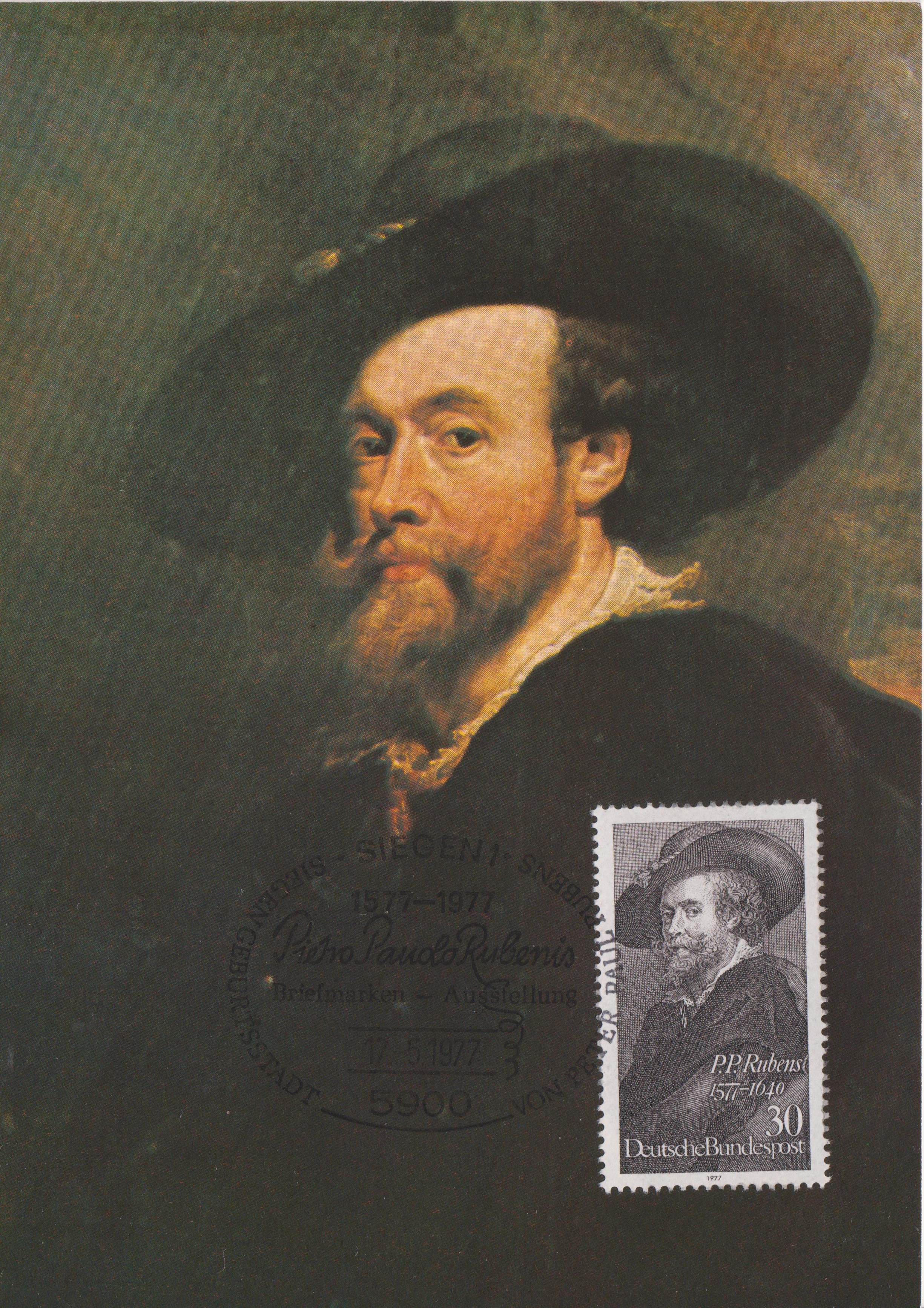 Zum 400. Geburtstag von Peter Paul Rubens erschien Deutsche Bundespost MiNr. 936 mit einem Selbstporträt, hier mit Sonderstempel aus SIEGEN vom 17.05.1977 (= Erstausgabetag) als Maximumkarte: