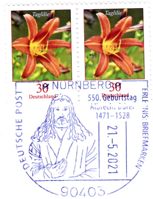 Auf einem weiteren Sonderstempel vom 21.5.2021 aus Nürnberg zum 550. Geburtstag von Albrecht Dürer sehen wir im Stempelbild ein weiteres Selbstbildnis von Albrecht Dürer.