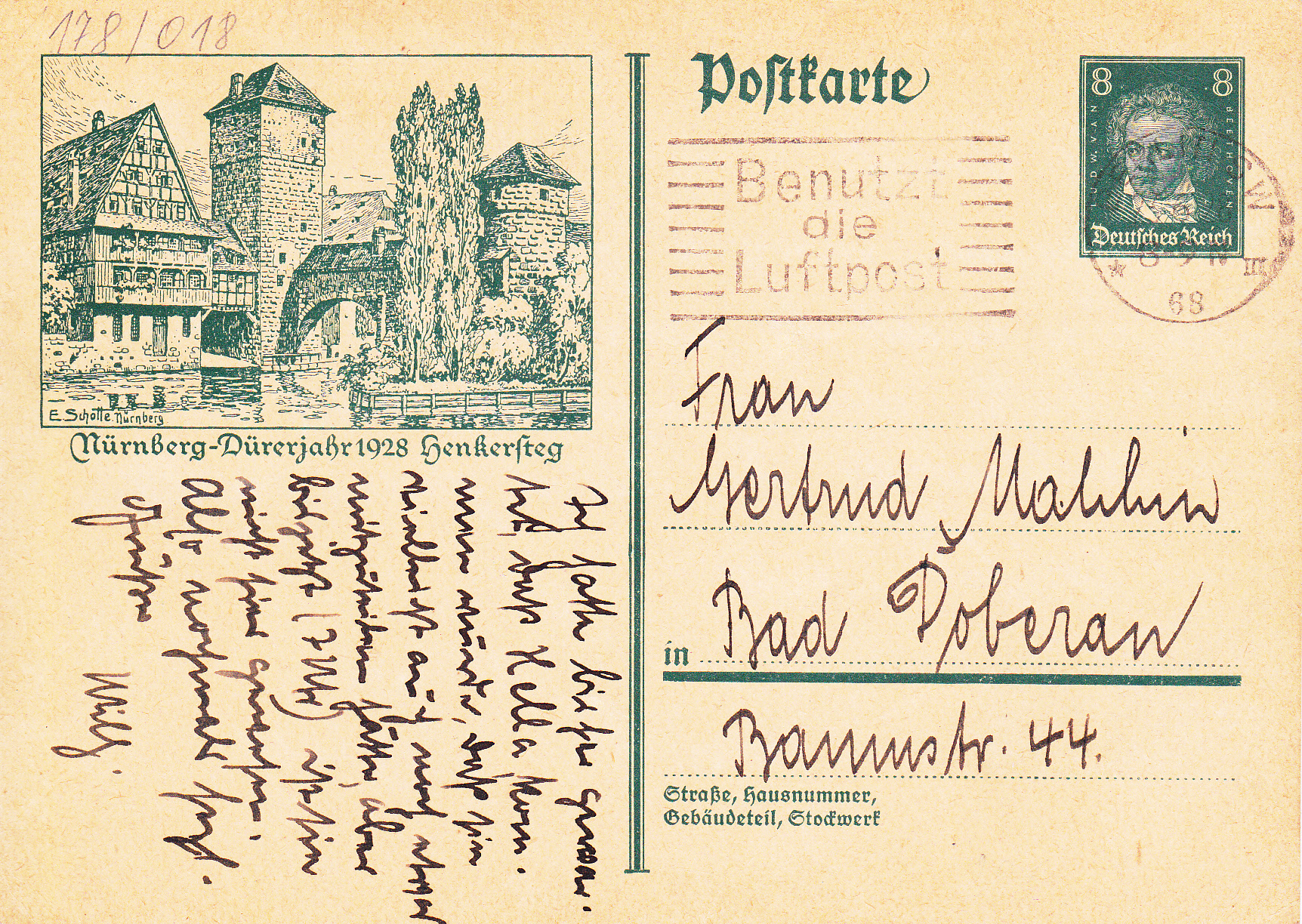 Diese Bildpostkarte (MiNr P 178/18) zeigt aus Anlass des "Dürerjahr 1928" (400. Todestag von Albrecht Dürer) eine Ansicht aus Nürnberg.
