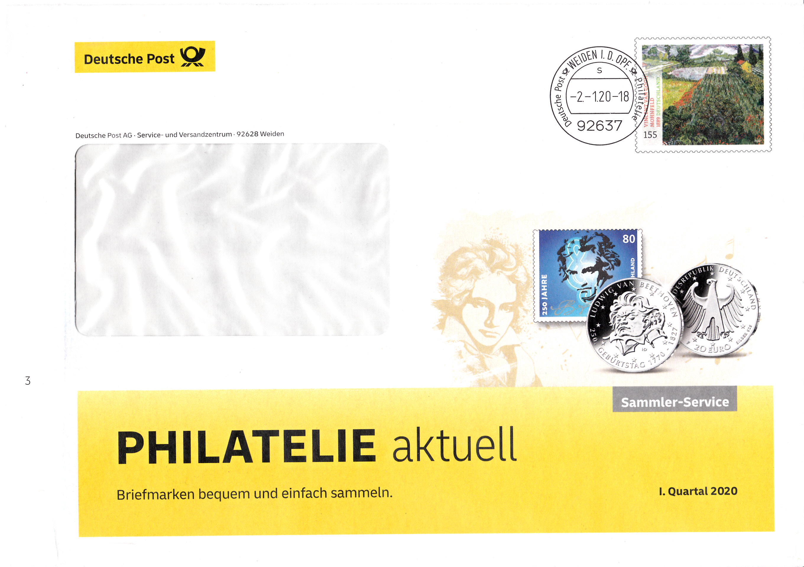 Umschlag im Format 229x162 mm mit einem Wertstempel mit der 155 Cent Marke (MiNr 3512) mit dem Gemälde "Mohnfeld" von Vincent van Gogh aus der Serie "Schätze aus deutschen Museen" mit aufgedruckter Zähnung und Vorausentwertung "Deutsche Post (Posthorn) WEIDEN I.D.OPF (Posthorn) Philatelie/ s / -2.-1.20-18".