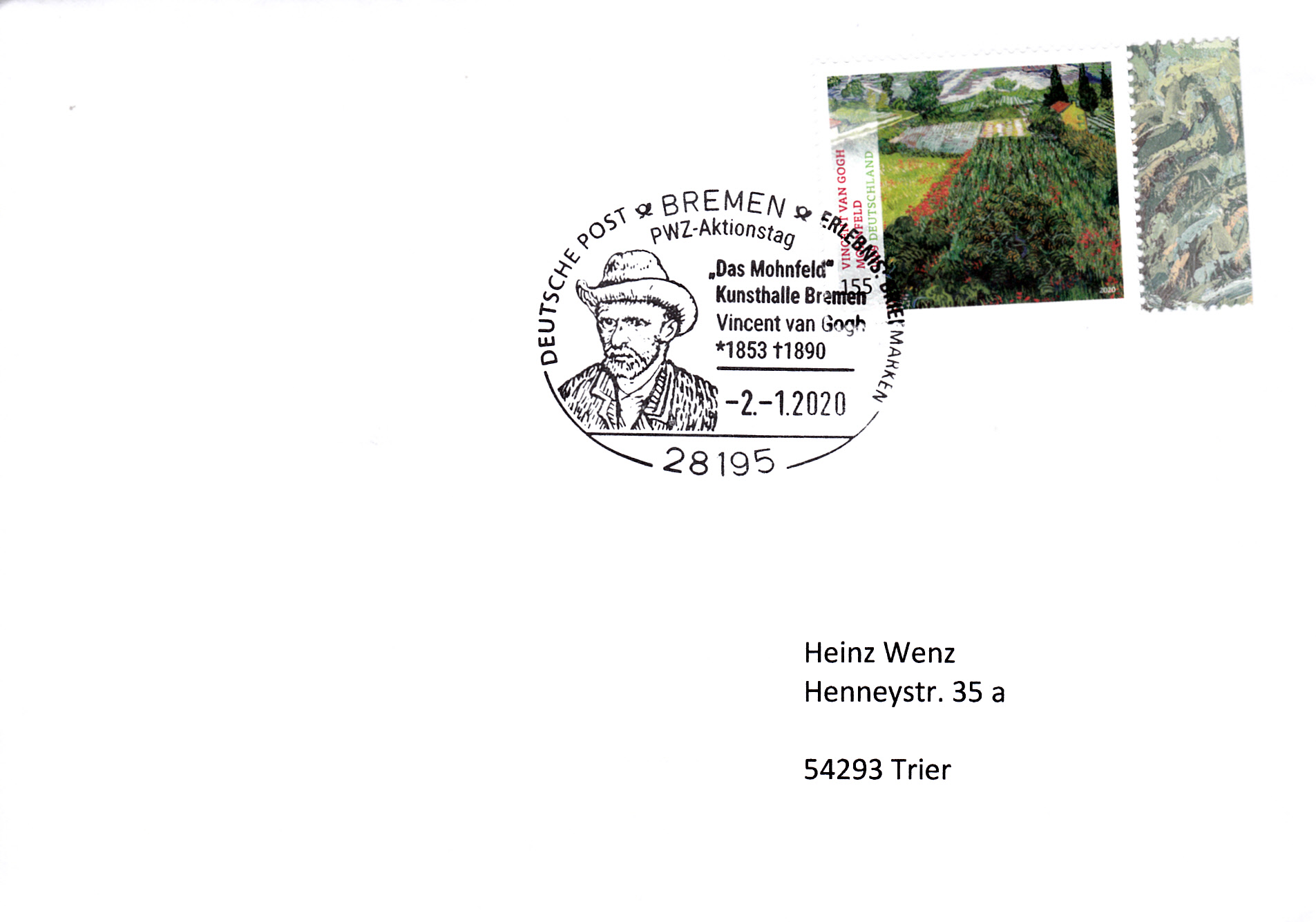 Am Ausgabetag der Marke (MiNr 3512) mit dem Gemälde "Mohnfeld" von Vincent van Gogh wurde in der Kunsthalle Bremen ebenfalls ein Sonderstempel eingesetzt. Dieser zeigt ein Porträt von Vincent van Gogh. Das Gemälde "Mohnfeld" ist im Besitz der Kunsthalle Bremen.