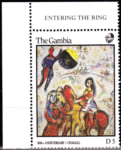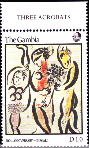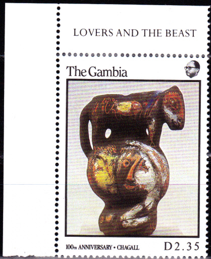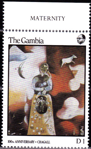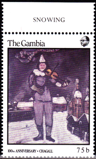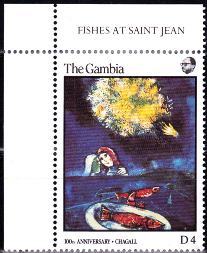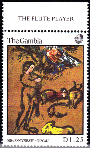 Zum 100. Geburtstag von Marc Chagall erschien in Monaco eine Briefmarke (MiNr 1835) mit seinem Kopfbild vor einem Gemälde.