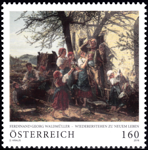 Zur Ausstellung "Bürgersinn und Aufbegehren - Biedermeier und Vormärz in Wien" in Wien ist in Österreich eine Marke (MiNr 1913) erschienen. Sie zeigt das Gemälde "Die Pfändung" von Ferdinand Georg Waldmüller.