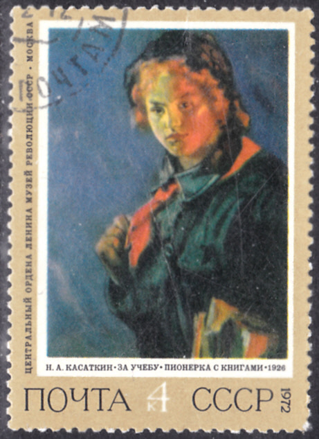 Aus der Sowjetunion kommt diese Marke (MiNr 4071) mit dem Gemälde "Pionierin mit Büchern" von Nikolaj Kassatkin.