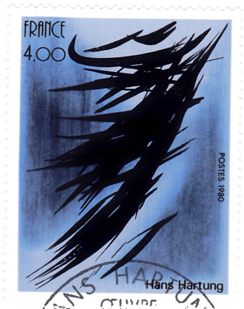In Frankreich wird auf dieser Marke (MiNr 2234) ein Gemälde von Hans Hartung abgebildet.