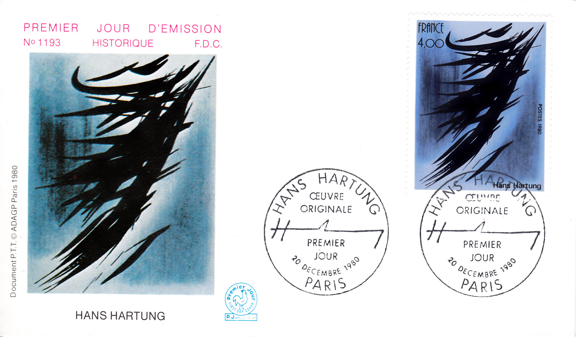 Im Ersttagsonderstempel aus Paris wird die Unterschrift von Hans Hartung gezeigt.
