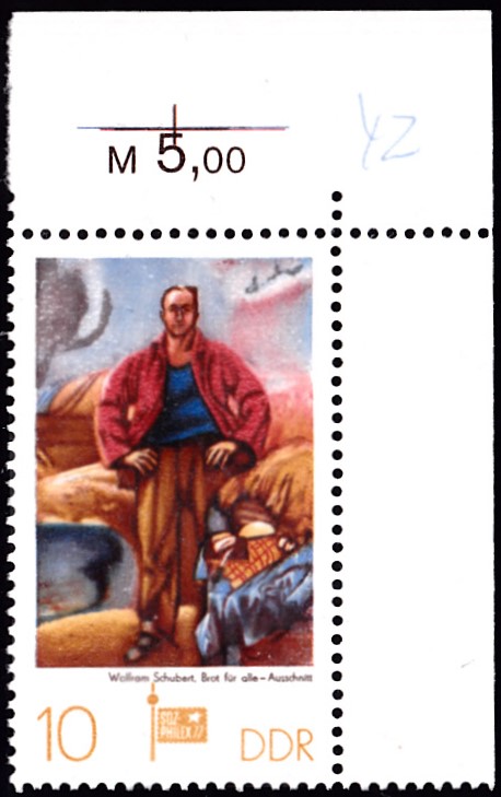 Auf einer Marke zur Internationalen Briefmarkenausstellung sozialistischer Länder SOZPHILEX ’77 in Berlin erschien in der DDR eine Marke (MiNr 2247) mit einem Detail aus dem Gemälde "Brot für alle" von Wolfram Schubert.