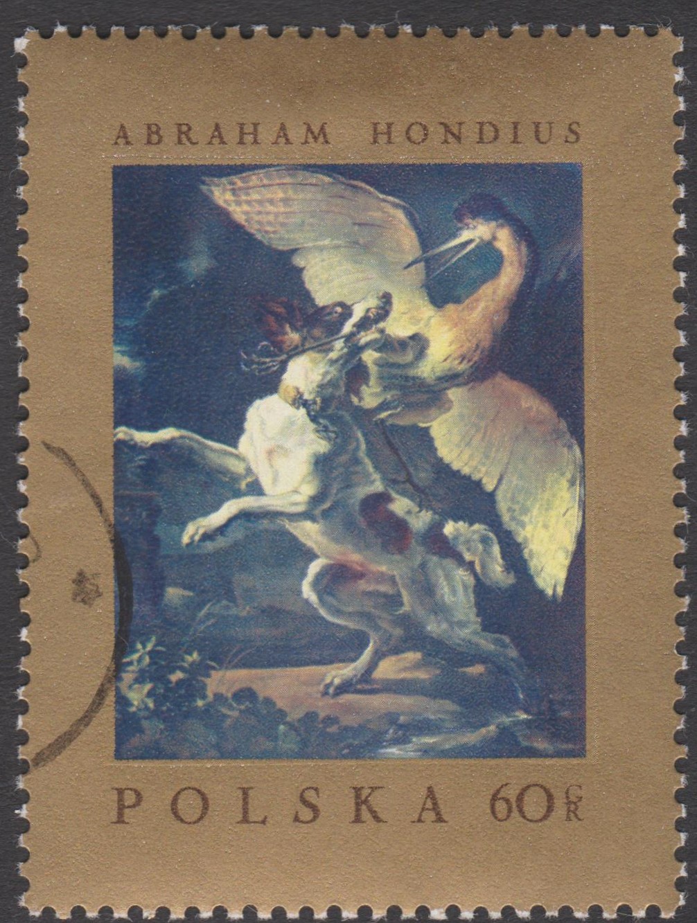 Abraham Hondius malte das Gemälde "Kampf zwischen Hund und Reiher" als Werk des niederländischen Barock, hier dargestellt auf Polen MiNr. 1810:
