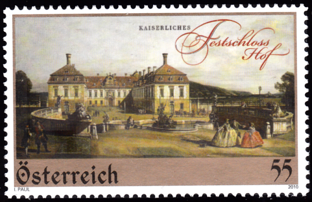 Eine Marke aus Österreich (MiNr 2866) zeigt das "Das kaiserliche Lustschloss Schloss Hof" (erbaut 1725/27) nach einem Gemälde von Bernardo Bellotto.