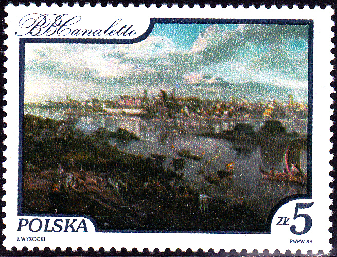 Eine Marke aus Polen (MiNr 2921) zeigt das Gemälde "Die Weichsel bei Warschau" von Bernardo Bellotto.