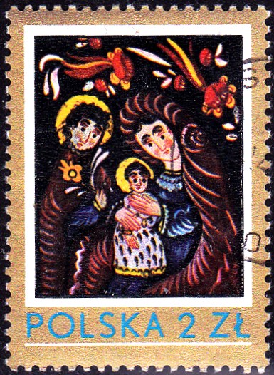 Auf einer Weihnachtsmarke aus Polen (MiNr 2657) sehen wir die Hinterglasmalerei "HI. Familie" von Ewelina Pęksowa.