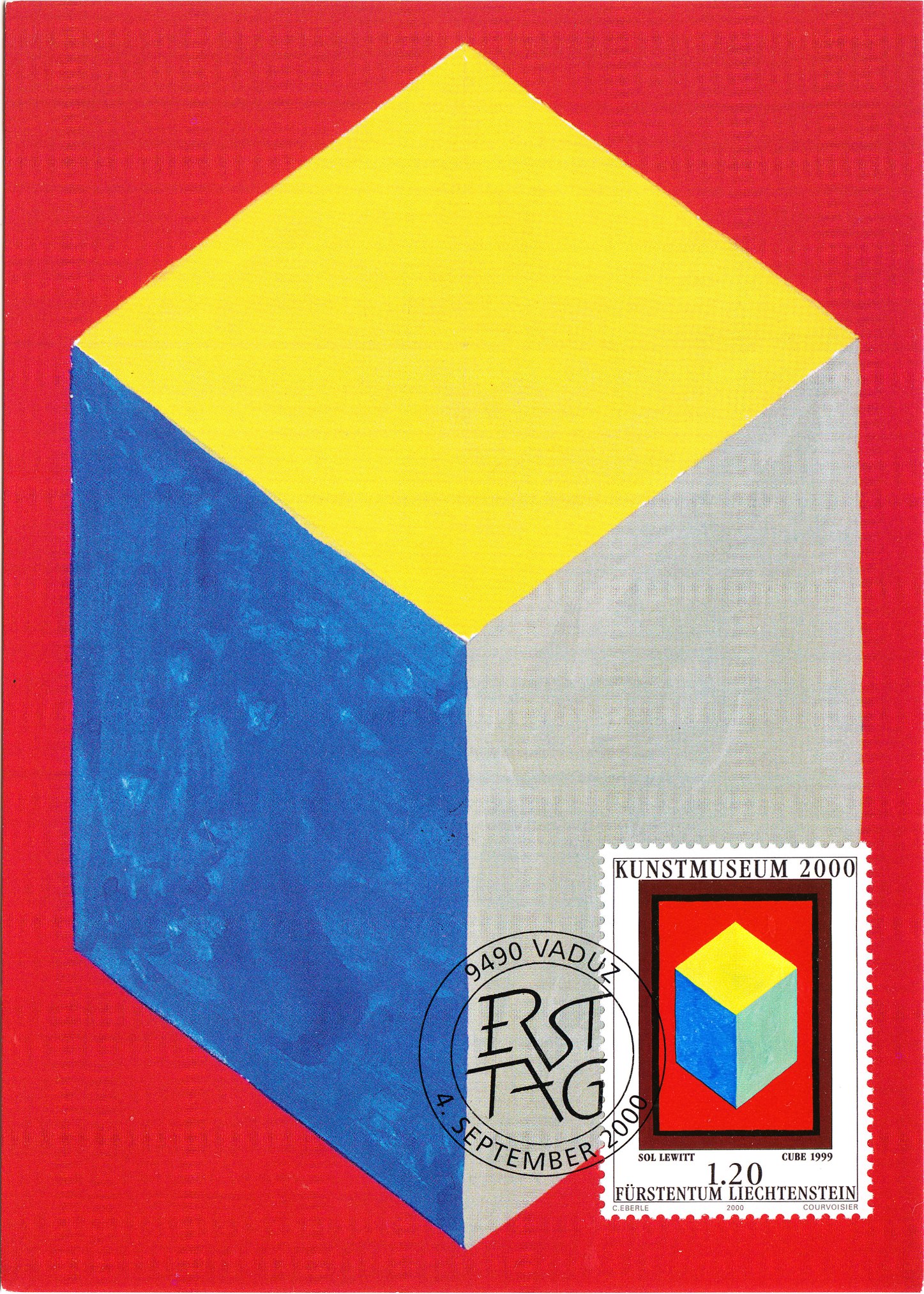 Diese Maximumkarte zeigt eine 2000 im Fürstentum Liechtenstein ausgegebene Briefmarke mit seinem Werk "Cube 1999", minimalistischer geht es dann wirklich kaum noch: