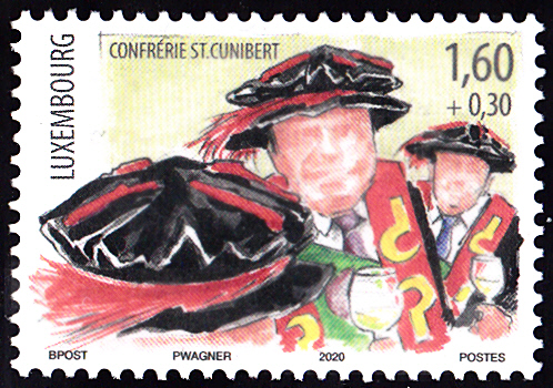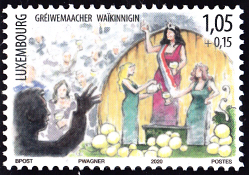 In der Serie Luxemburger Moselregion "Brauchtum" erschien in Luxemburg diese Marke (MiNr 2244) zum Thema "Weinfest in Schwebsingen" mit einer Illustrationen von Pit Wagner.