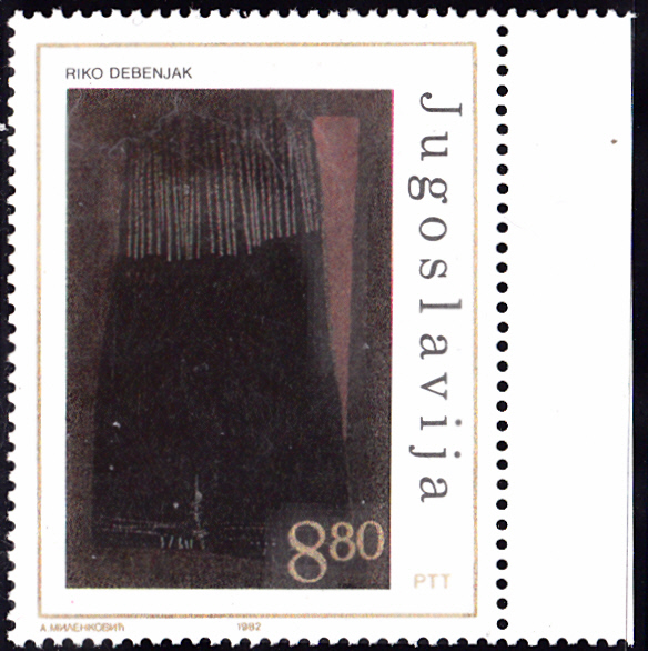 In einer Serie "Zeitgenössische Malerei" erschien in Jugoslawien diese Marke (MiNr 1959) mit dem Gemälde "Schwarzer Kamm mit rotem Band" von Riko Debenjak.