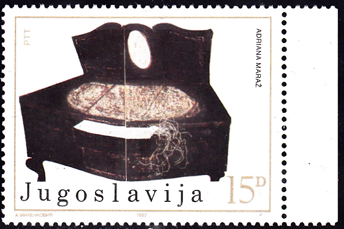 In einer Serie "Zeitgenössische Malerei" erschien in Jugoslawien diese Marke (MiNr 1961) mit dem Werk "Die Vitrine" von Adriana Maraž.