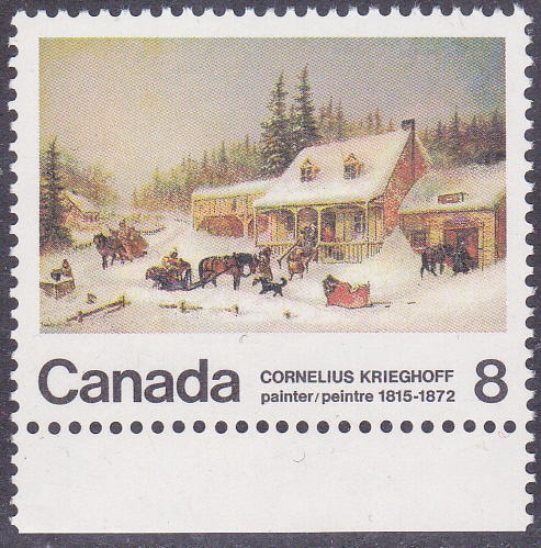 Zum 100. Todestag von Cornelius Krieghoff erschien in Kanada eine Marke (MiNr 517) mit dem Gemälde "Die Schmiede" von Cornelius Krieghoff.