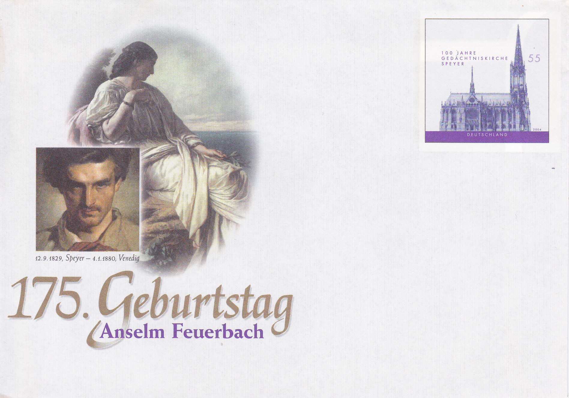 Zum 175. Geburtstag von Anselm Feuerbach ist dieser Gedenkumschlag (MiNr USo 80) mit dem Wertstempel "Gedächtniskirche Speyer" (MiNr 2415) erschienen. Auf dem Umschlag sehen wir links ein Selbstbildnis und einen Ausschnitt aus "Iphigenie" von A. Feuerbach.