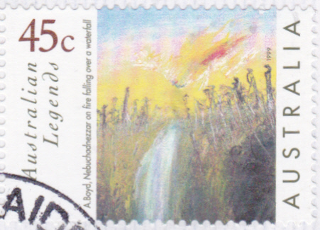 Auf einer zweiten Marke (MiNr 1787 I) sehen wir das Gemälde "Brennender Nebukadnezar fällt über einen Wasserfall" von Arthur Boyd.