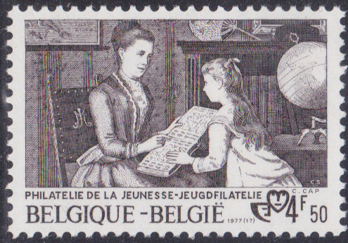 Eine Marke aus Belgien (MiNr 1921) zeigt "Privatunterricht" mach einem Gemälde von Constant Cap.