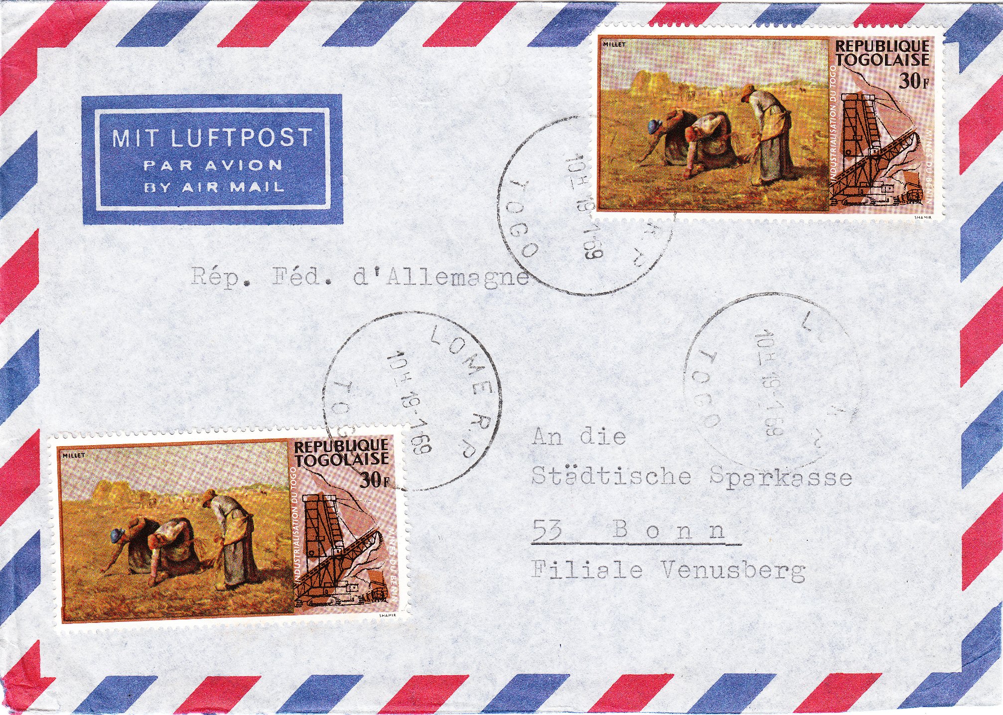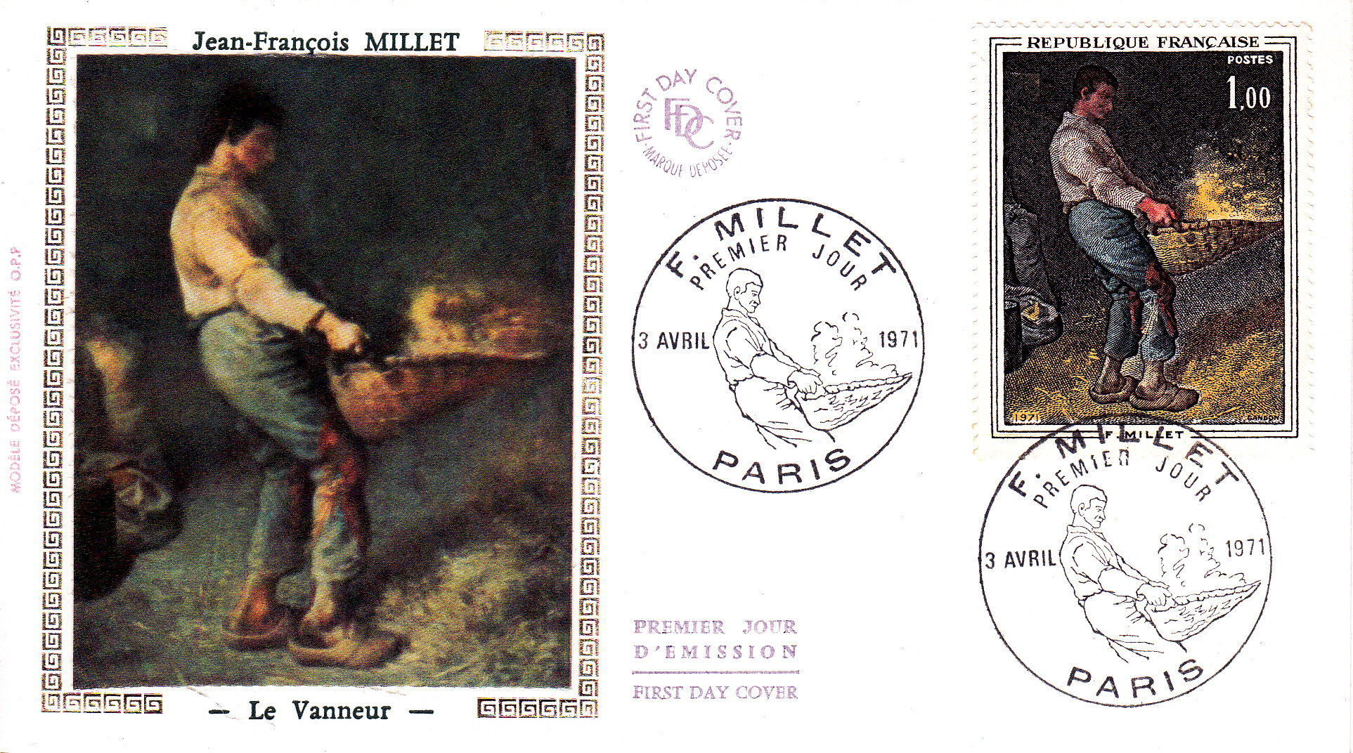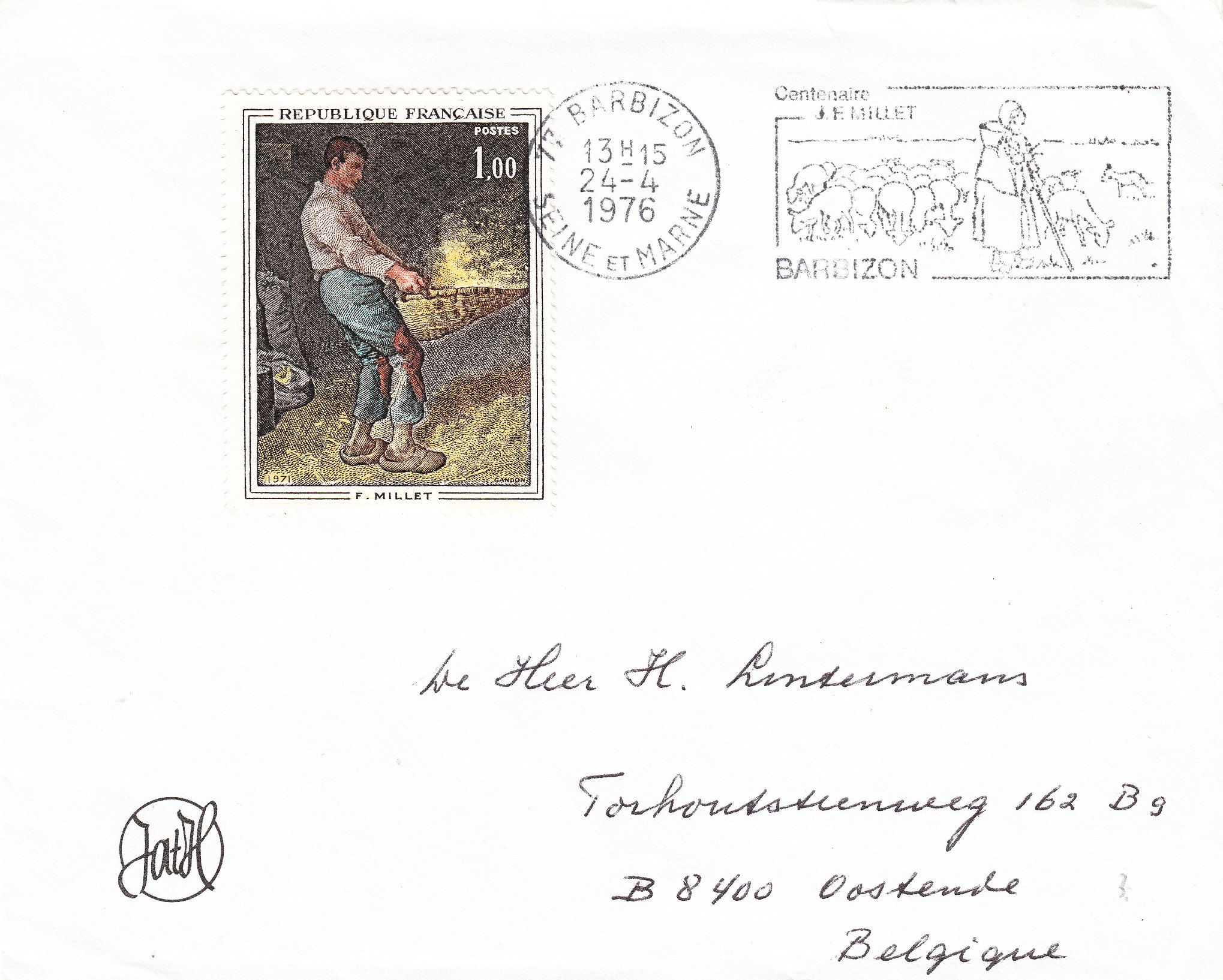 Hier ein Beleg, der als Frankatur eine französische Sondermarke mit der Darstellung seines 1848 entstandenen Gemäldes "Le Vanneur = Der Kornschwinger" trägt: