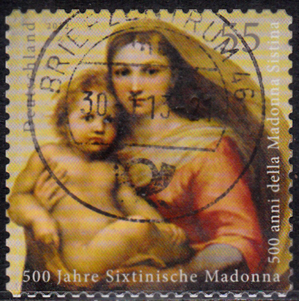 In der Markenserie "Von der Sowjetunion zurückgeführte Gemälde der Dresdner Gemäldegalerie" erschien eine Marke zu 70Pf (MiNr 509), die einen Ausschnitt aus dem hier schon erwähnte Gemälde "Sixtinischen Madonna" von Raffael zeigt.
