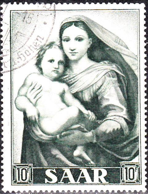 Im Saarland ist diese Marke (MiNr 352) 1954 zum Marianischen Jahr erschienen. Im Markenbild ist auch hier ein Detail aus der Sixtinischen Madonna von Raffael zu sehen.