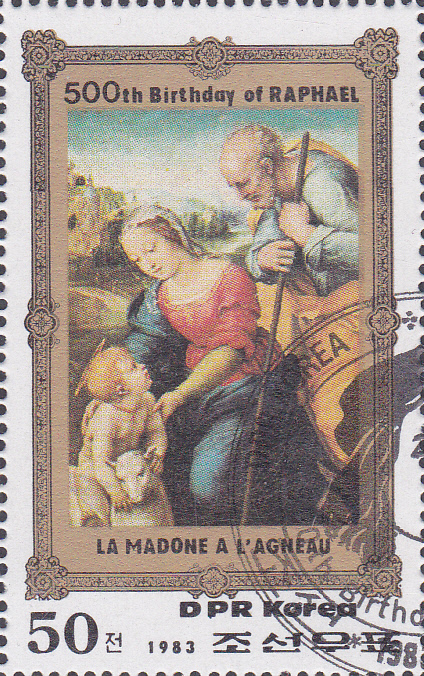 Diese Marke aus der gleichen Ausgabe aus Korea-Nord (MiNr 2343) hat als Motiv Raffaels Gemälde "Die schöne Gärtnerin". Die schöne Gärtnerin (La belle jardinière) wird auch "Madonna und Kind mit Johannes dem Täufer" genannt. Es ist eins der bekanntesten Marienbilder Raffaels.