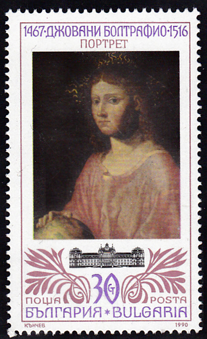 Auf dieser Marke aus Bulgarien (MiNr 3823) aus einer Serie "Gemälde ausländischer Maler" wird ein Frauenporträt gemalt von Giovanni Antonio Boltraffio gezeigt.