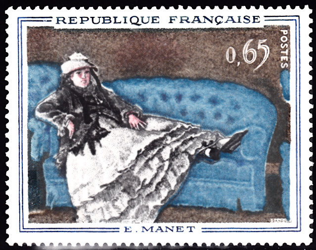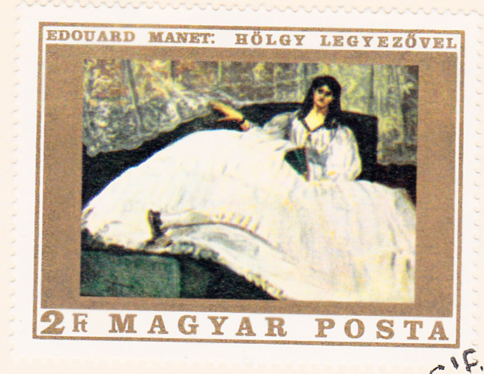 Hier eine Marke aus Ungarn (MiNr 2509 A) aus einer Serie "Gemälde französischer Meister" mit der Abbildung des Werkes "Dame mit Fächer" von Édouard Manet.