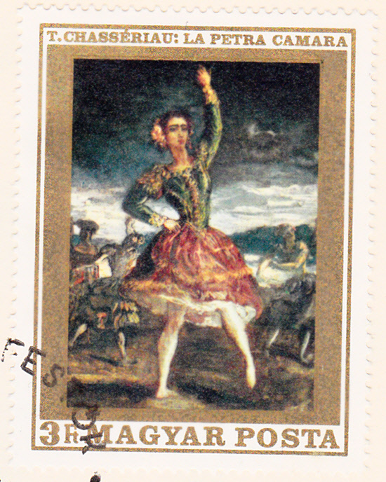 Hier eine Marke aus Ungarn (MiNr 2510 A) aus einer Serie "Gemälde französischer Meister" mit der Abbildung des Werkes "Tänzerin La Petra Camara" von Théodore Chassériau.